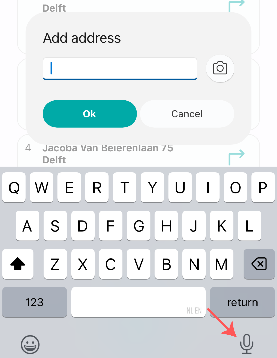 You can enter addresses by clicking on the “Enter” button (right side below). Then the keyboard with microphone appears, if the microphone feature is enabled in the settings of your smartphone. Click on the microphone on the IOS keyboard (image 1) or Android keyboard (image 2) and read out the address.